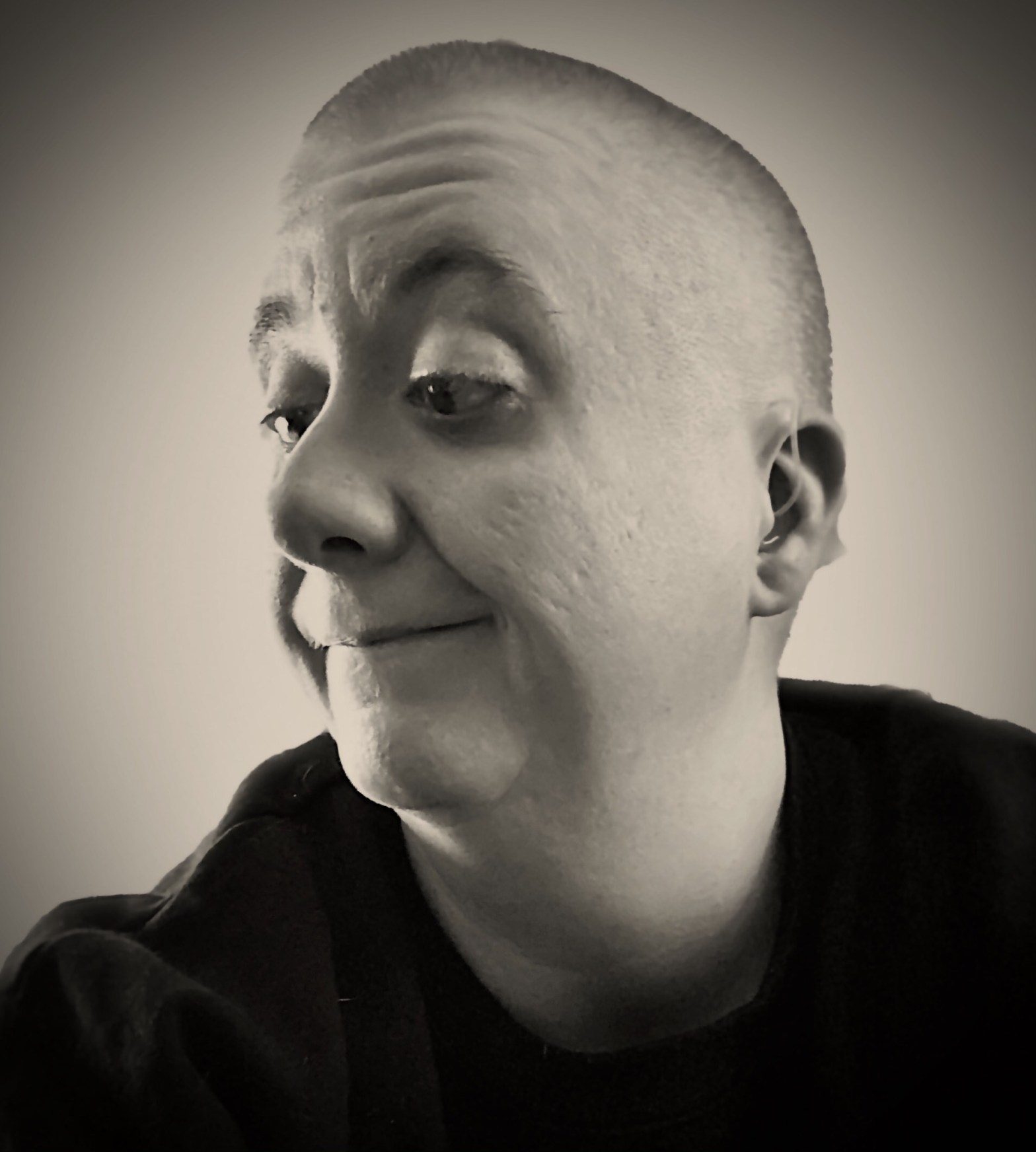 (Photo Description: A black and white selfie of Codee looking to the left.)