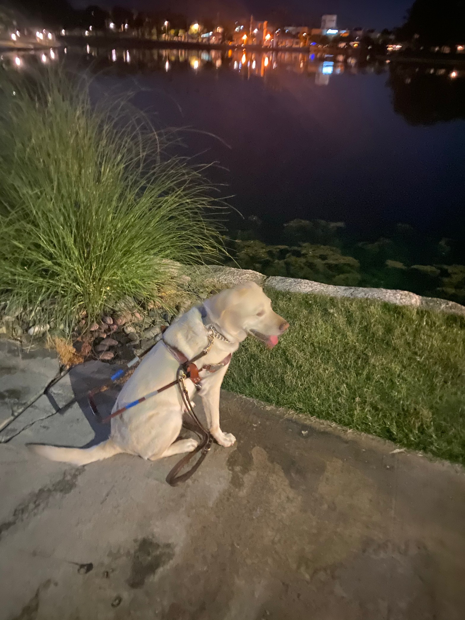 (Photo Description: Golden Labrador Guide Dog Kasha is wearing her harnass as she sits on some grass, deep in thought.)