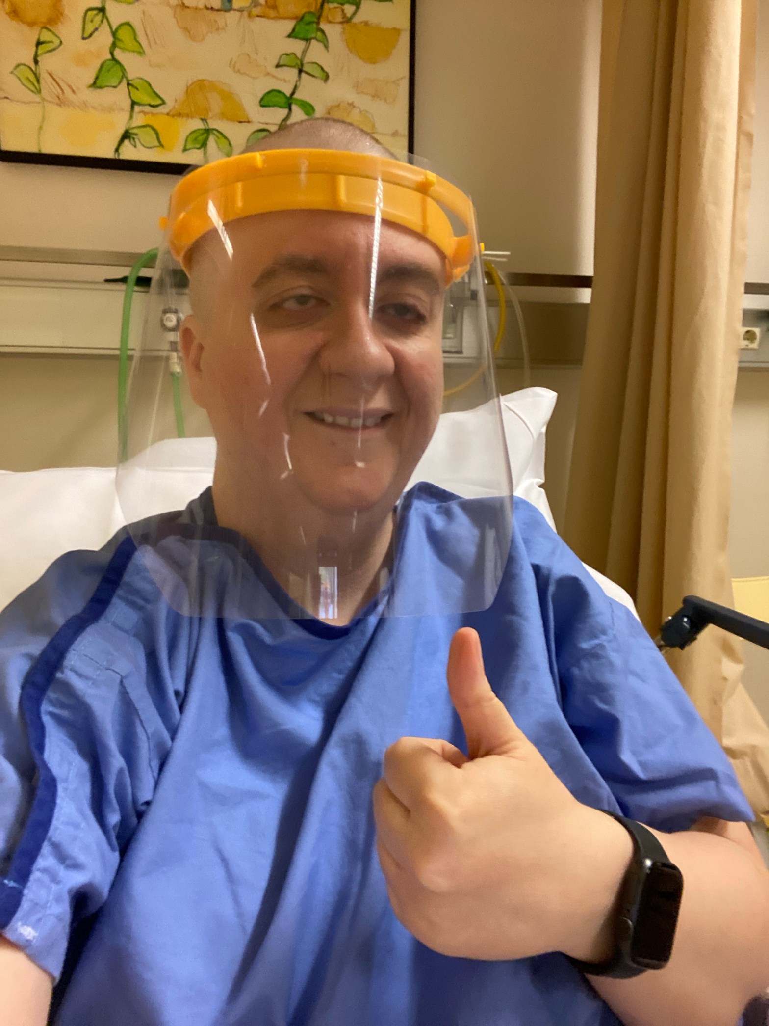 (Photo Description: Codee sitting up in a hospial bed, wearing a clear face shield. Smiling with her thumb up.)