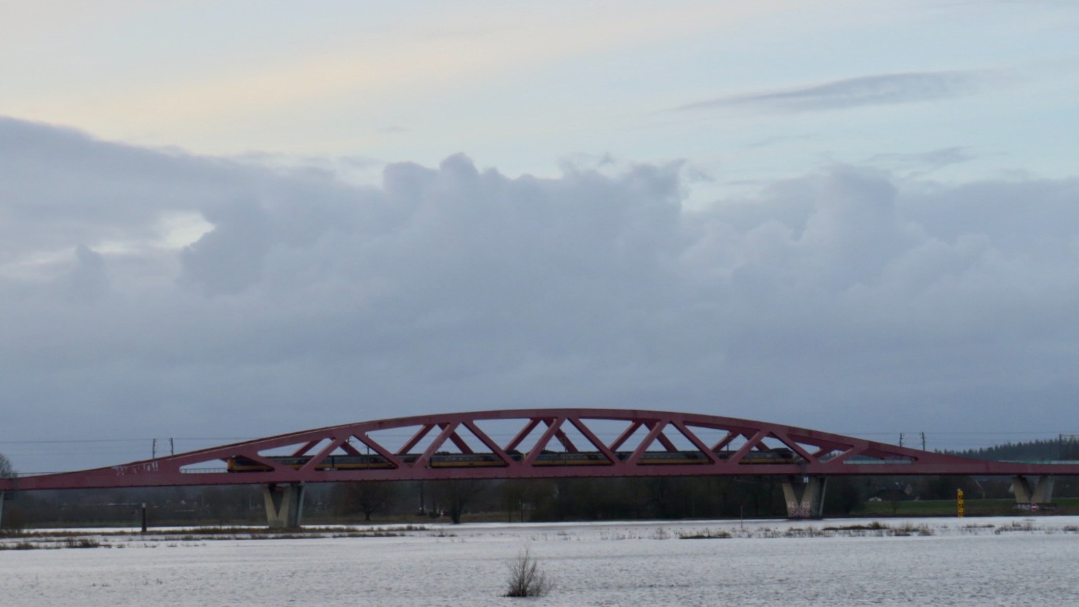 (Photo Description: A blue, white and yellow NS train crossing a red bridge on a cloudy day.)