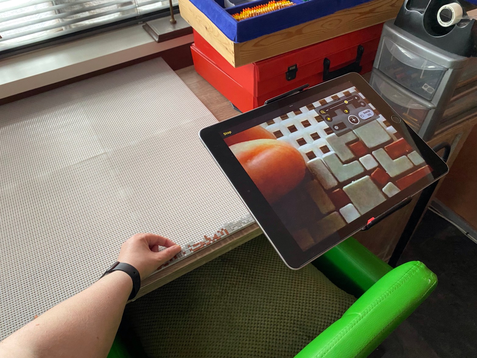 Photo Description: An iPad mounted on a tripod, being used to magnify a ministeck project.