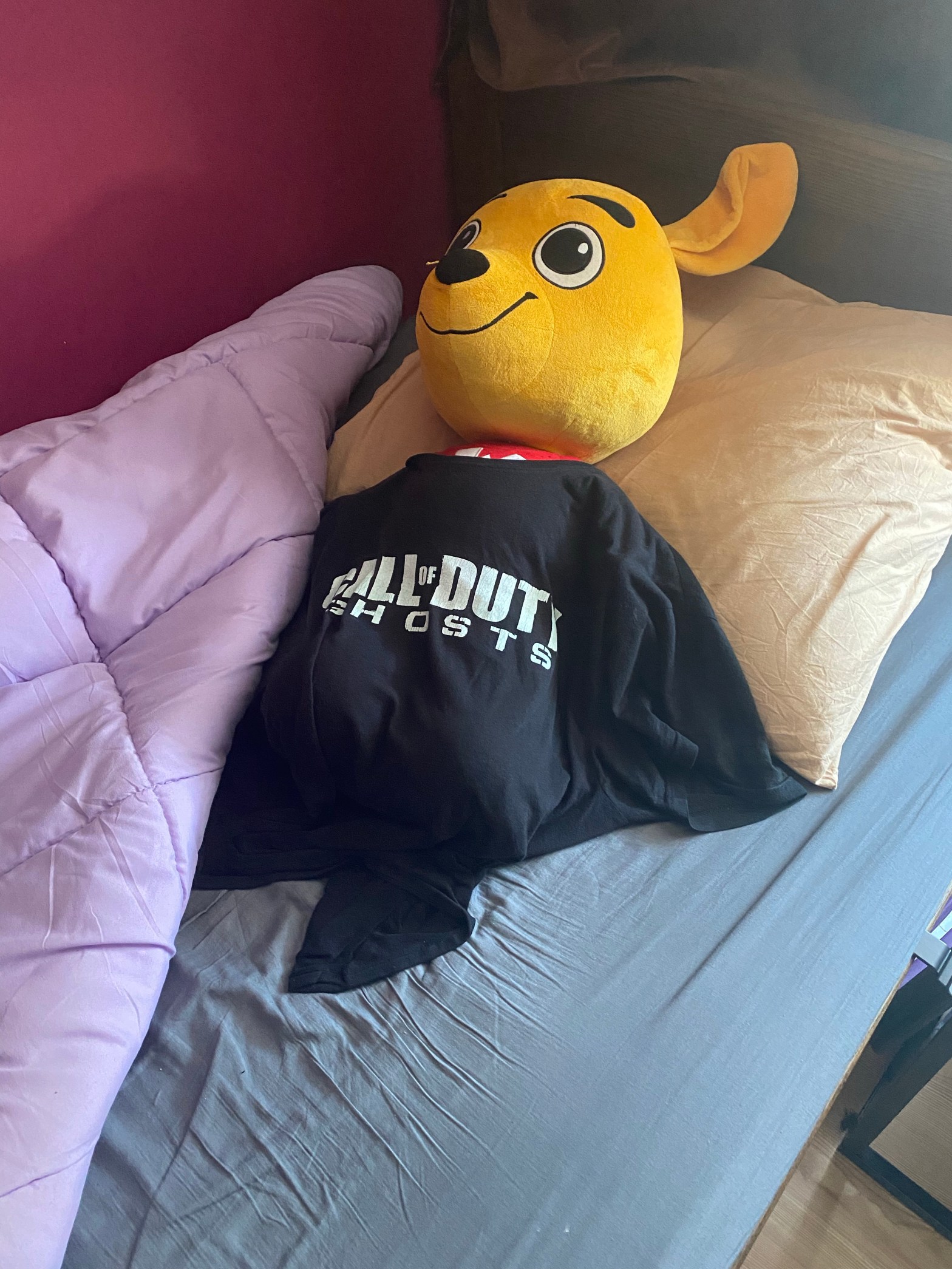 Image Description: Wally the pluche yellow walibi laying in Codee’s bed, wearing her pyjamas.