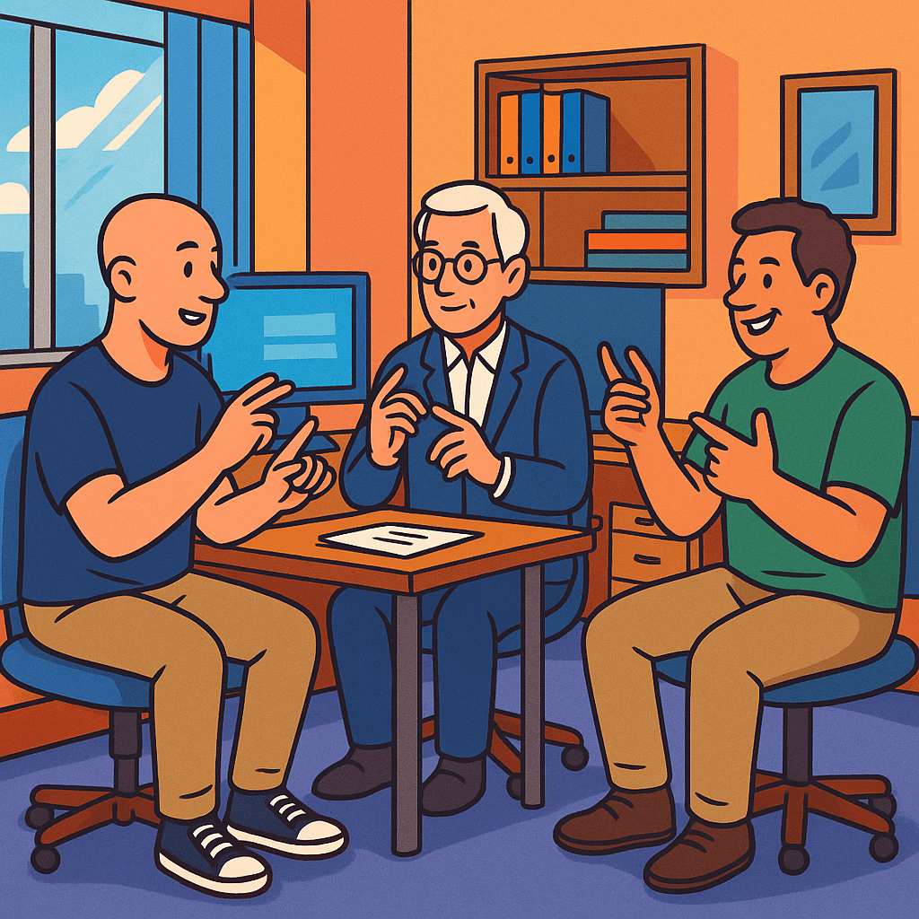 I shared the room with John and George. John was built like a linebacker in khakis and a faded green tee, while George looked like a pocket-sized professor in a crisp blue blazer and matching pants. Between them, a kind of mysterious magic happened—signing back and forth with full-body expressions and flying hands whenever Ellen (our administrator) left the room. Which was… often. Suspiciously often.
